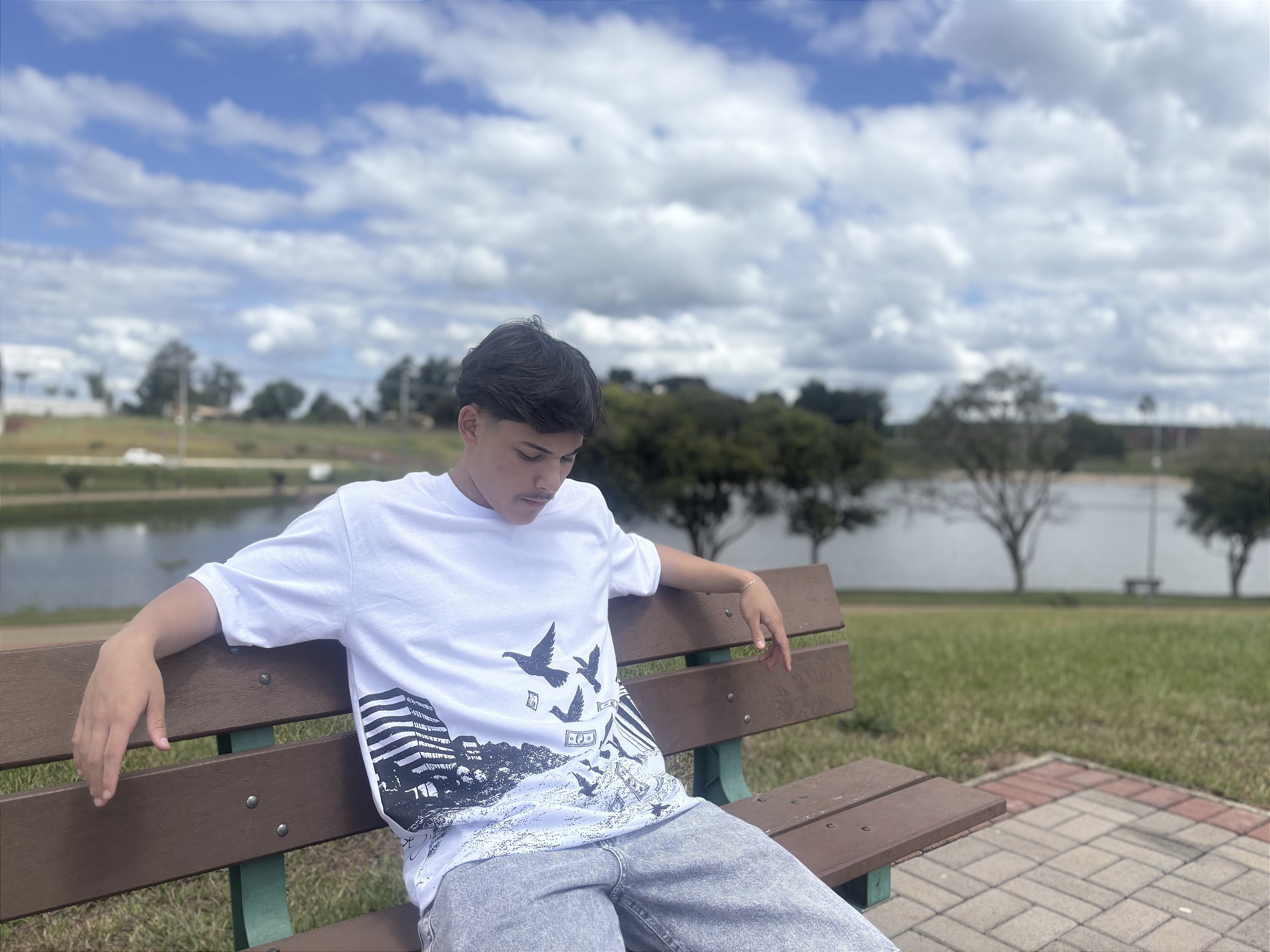 A camiseta branca da Mouttee combina estilo urbano com design moderno e marcante. A estampa exclusiva em preto traz pássaros, notas e elementos arquitetônicos em um visual forte e atual, ideal para quem gosta de peças diferenciadas.